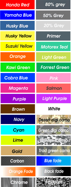 • Note: Colors may vary, KTM orange varies from year to year sometimes lighter sometimes brighter.  Printed colors are CMYK process and colors are mixed to match.  Brighter fluorescent colors are not as bight in this process. Brighter ink is an option in extras at an additional cost.